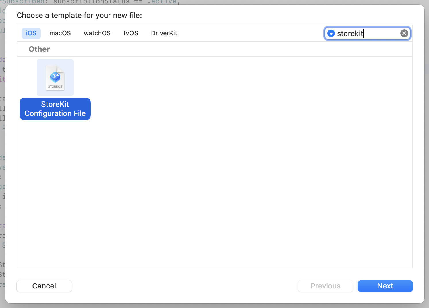 Go to File ▸ New ▸ File... in the menu bar , select StoreKit Configuration File and hit Next: