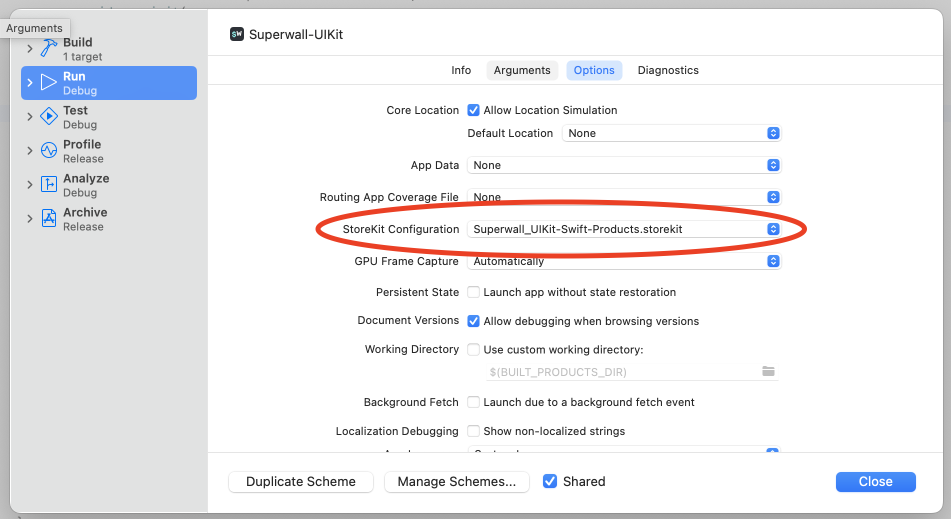 In the scheme editor, add the StoreKit Configuration file to your scheme by clicking on Run in the side bar, selecting the Options tab and choosing your configuration file in StoreKit Configuration. Then, click Close: